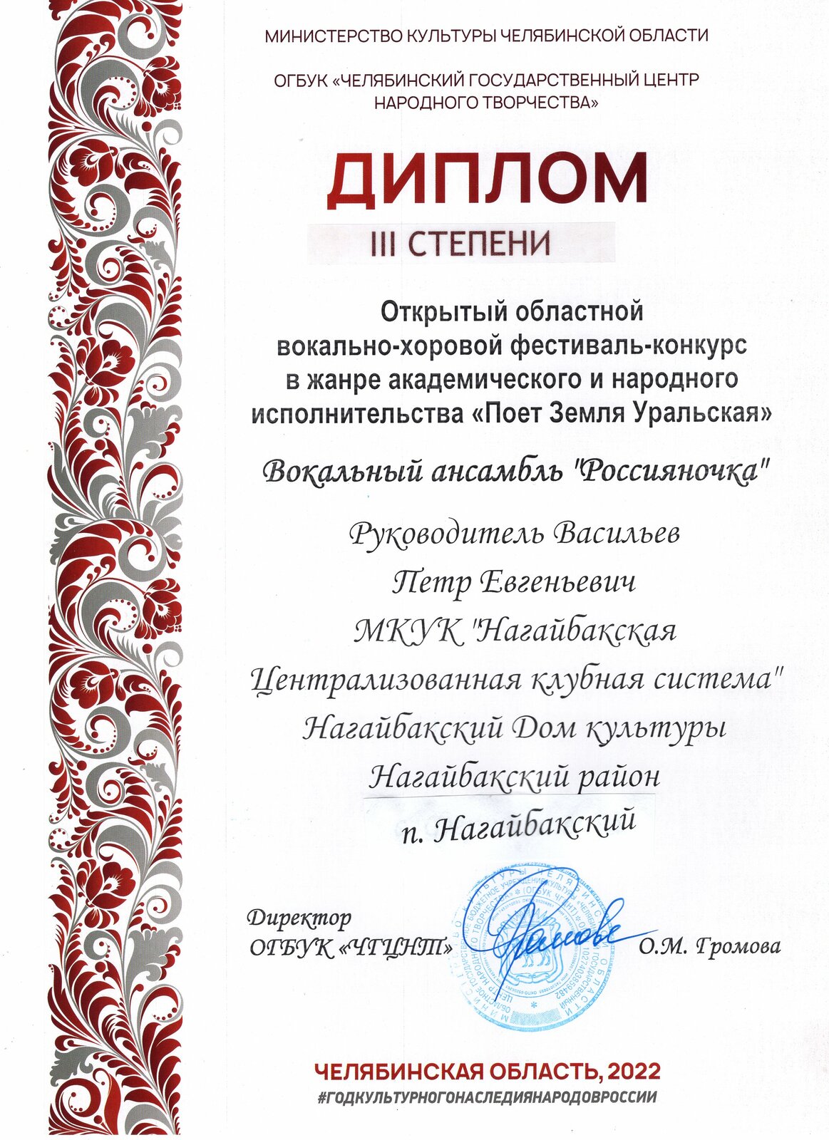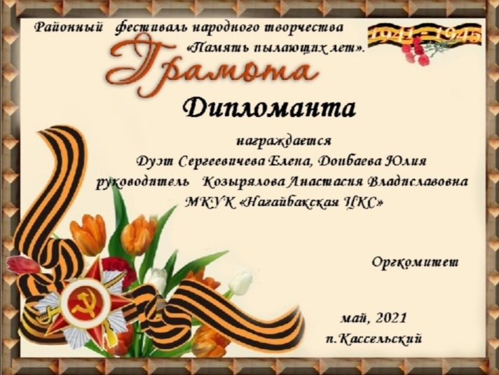 Коллективы и участники художественной самодеятельности нашего Дома культуры, представляя Нагайбакское сельское поселение, принимают активное участие в конкурсах и фестивалях разных уровней. Итогам долгой и кропотливой работы над развитием вокально - исполнительской культуры и художественно - творческого мастерства являются полученные нами грамоты и дипломы.